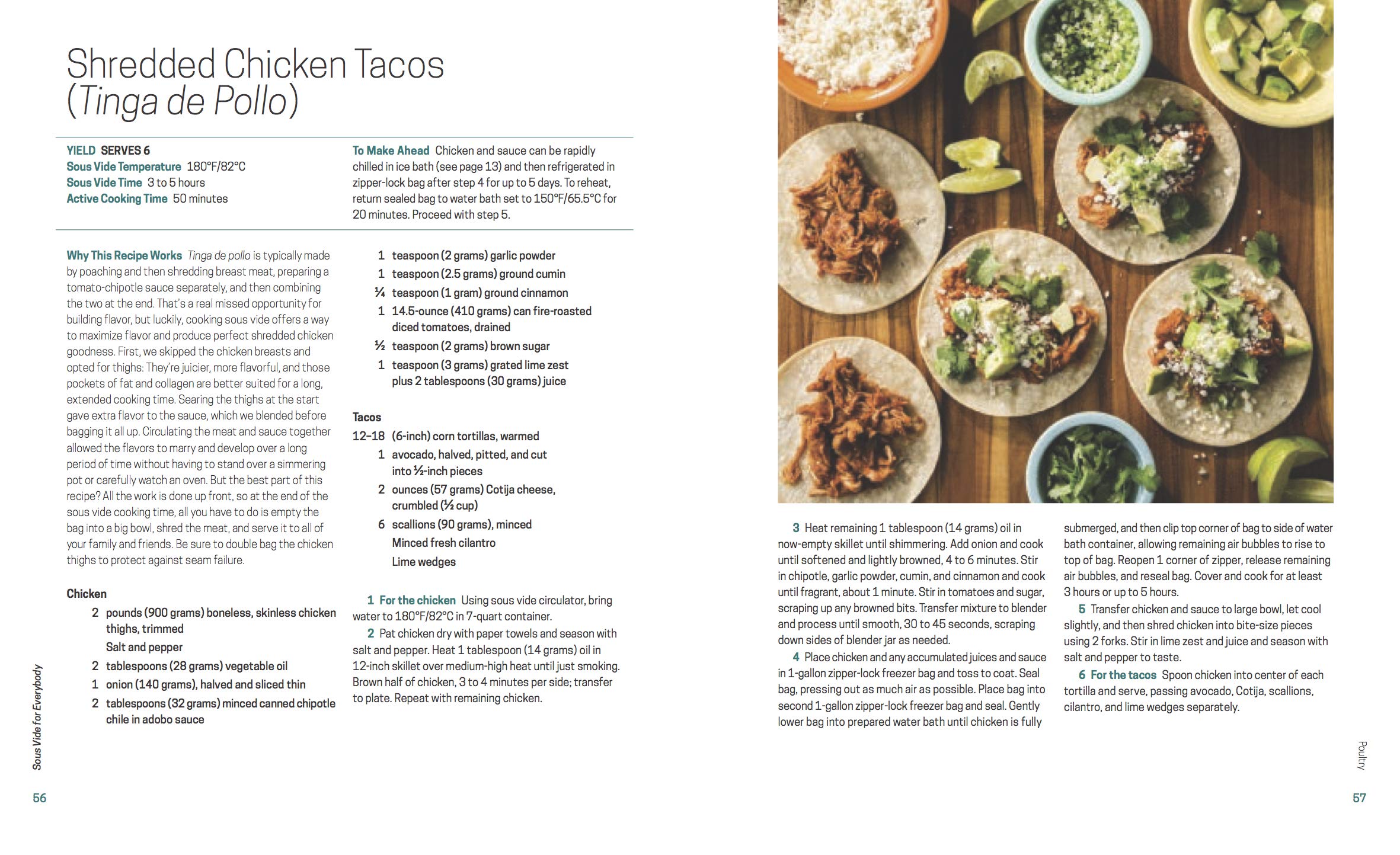 Sous vide shredded chicken tacos. Cook the halibut sous vide: Cooking fish sous vide is often akin to a work of alchemy, with perfectly tender fillets benefiting from the slow and gentle cooking that it offers. Put the fish into a small (1 quart/0.9 liter) cooking pouch and vacuum seal. If you are looking for an easy fish taco recipe you need to make my easy mahi mahi taco recipe.